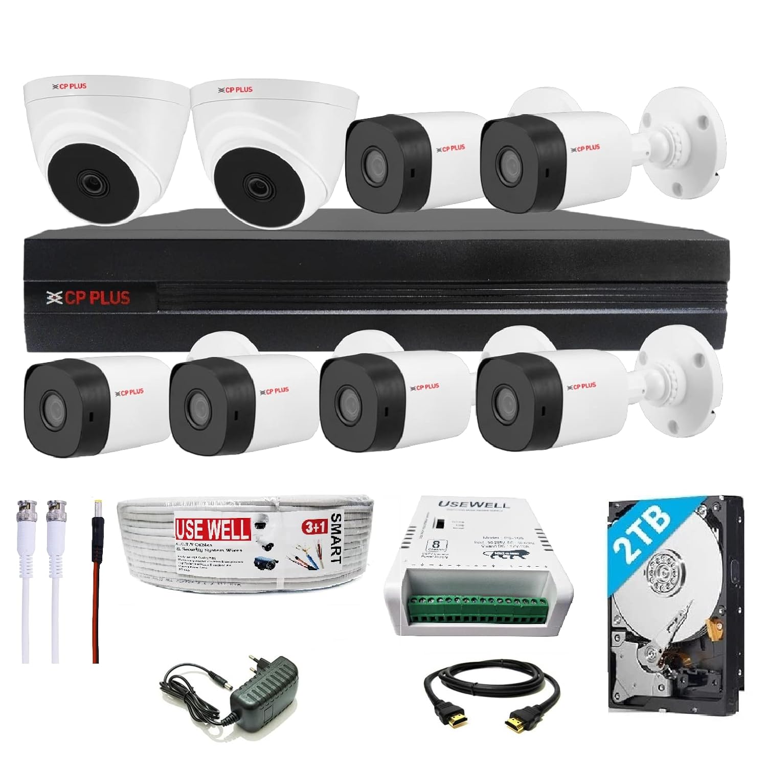 CP PLUS Full HD 8 Channel DVR with 2.4 MP 2 Dome & 6 Bullet Cameras + 2 TB HDD + (3+1) Cable roll + 8 CH Power Supply + USEWELL BNC & DC Full Combo Kit