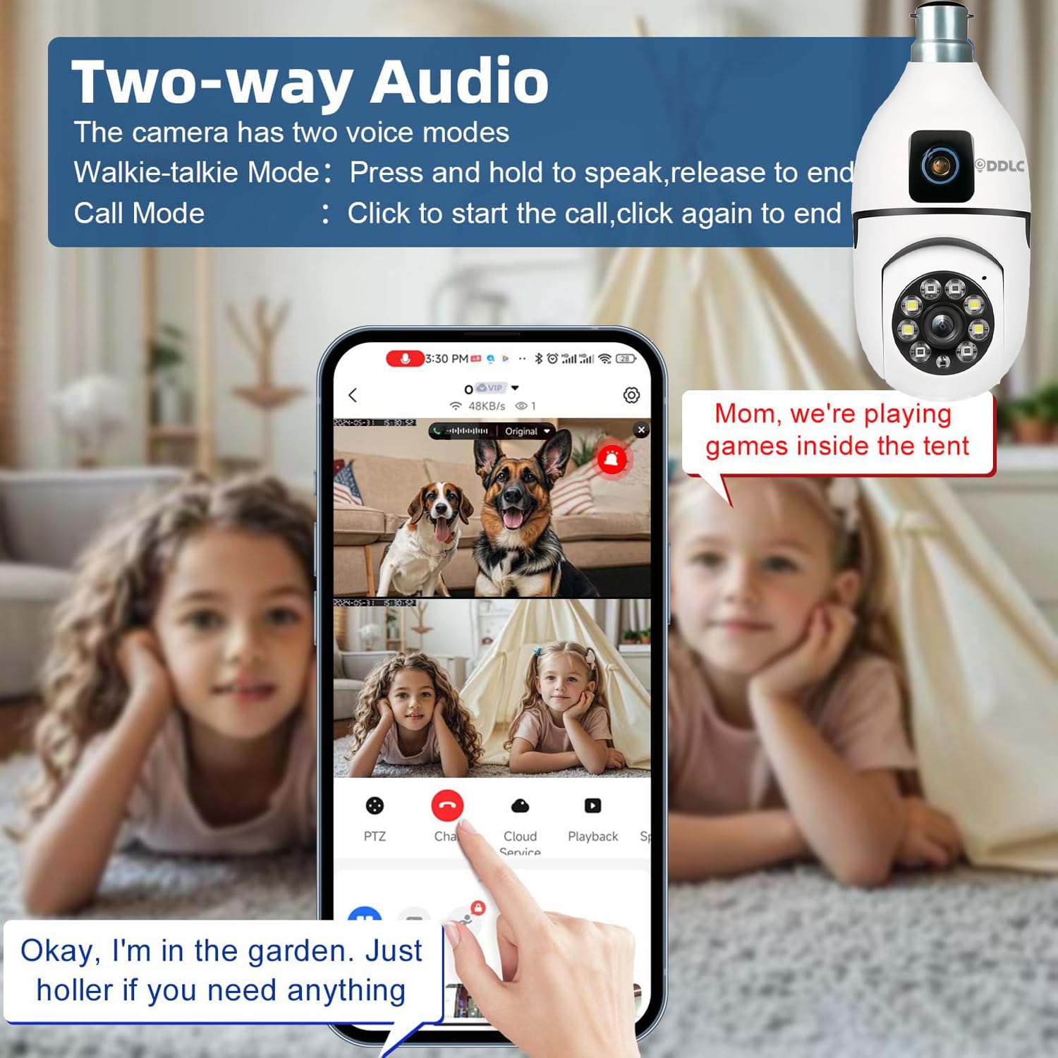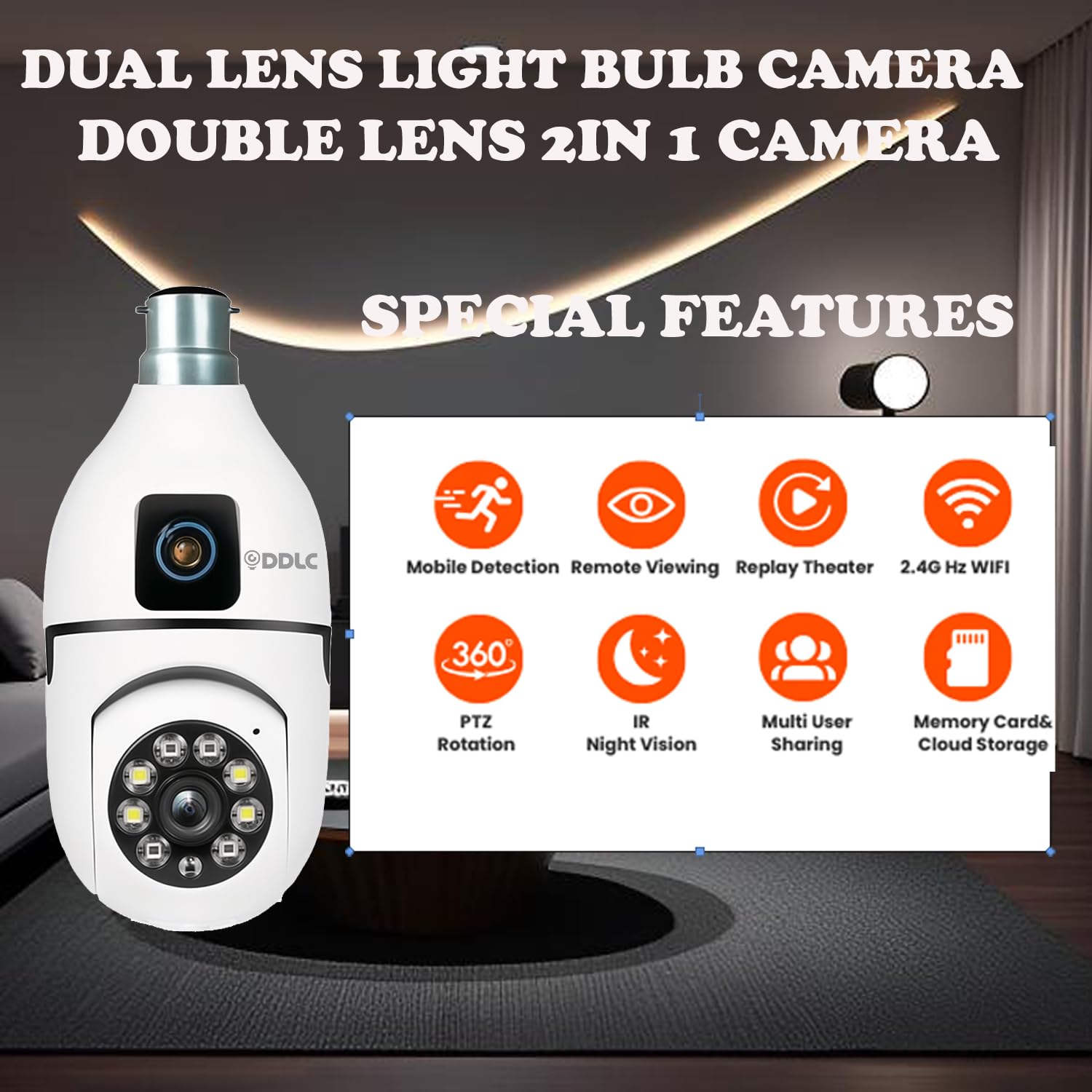 DDLC Wi-Fi Wireless Bulb Shape Outdoor Indoor 360° Smart Home Security CCTV Camera 24×7 Continuous Recording with Motion Sensor, Auto Tracking Two Way Audio, (Dual Lens Light Bulb)