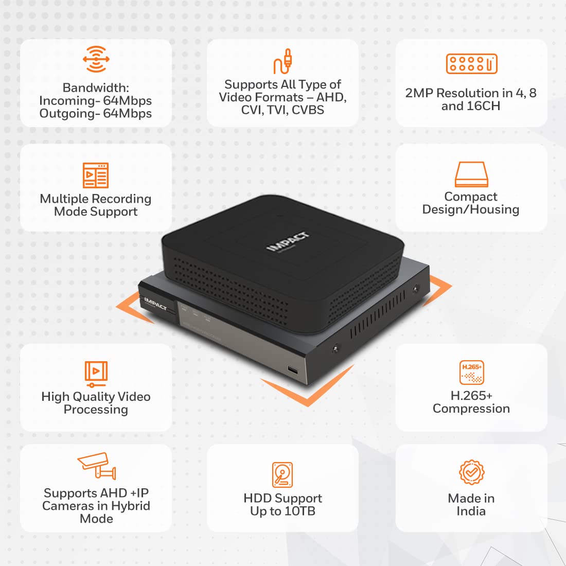 IMPACT by Honeywell 8 Channel HD DVR with Advanced Detection Capabilities, 1 SATA Upto 10TB, H.265 Compression, Supports AHD + IP Cameras, Compatible with All Brand Cameras (1080P, I-HA-DVR-2108-L)