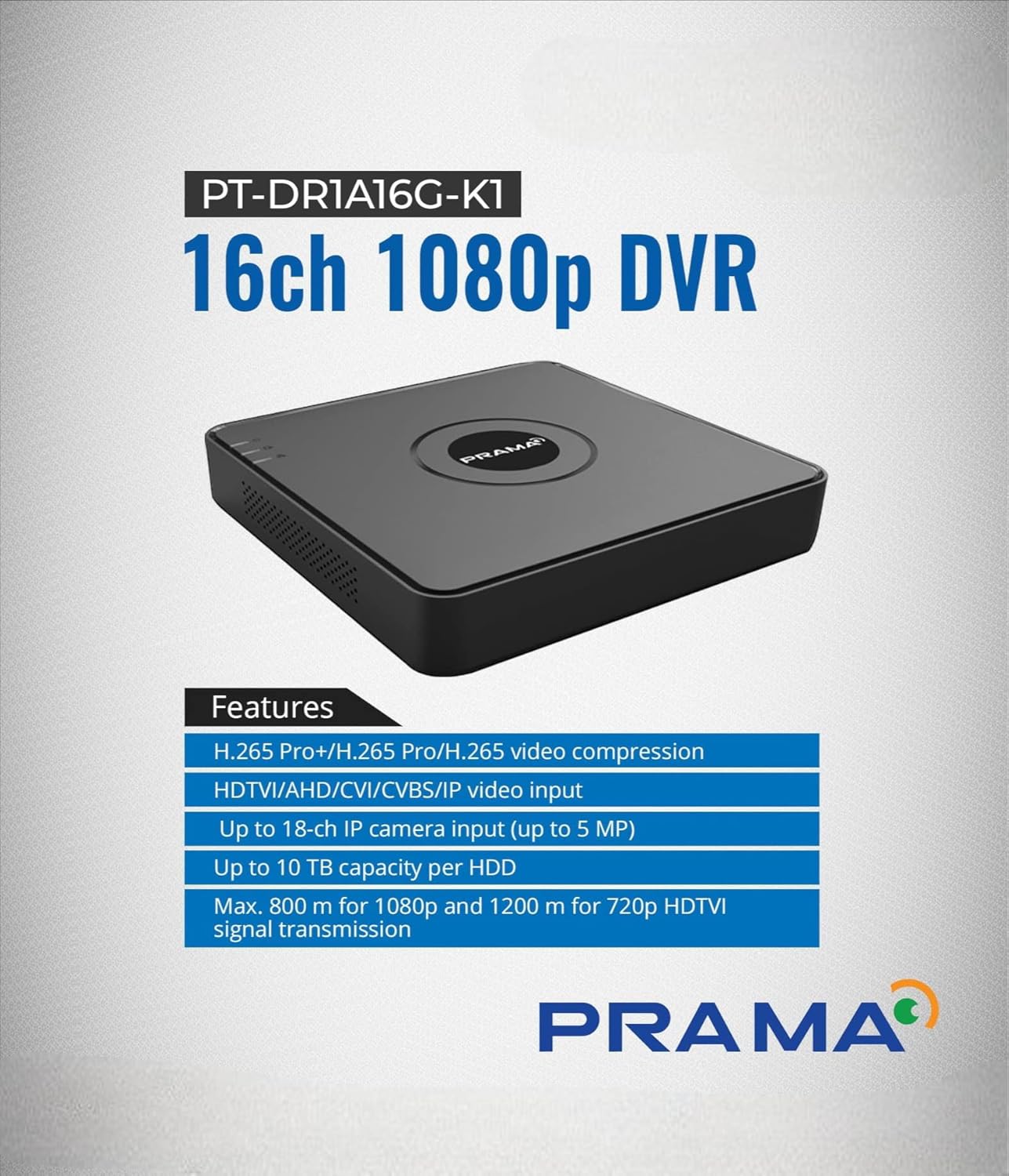 PRAMA 16 Channel H.265 2 MP DVR [PT-DR1A16G-K1] for Upto 2MP CCTV Cameras with USEWELL HDMI, Black