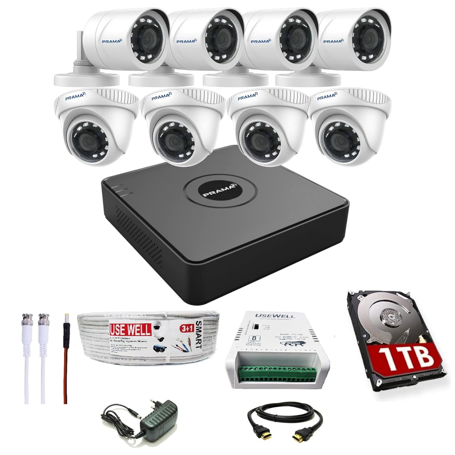 Prama 2MP Full HD CCTV kit with 8 Channel DVR + 4 Outdoor & 4 Indoor Cameras + 1 TB HDD + USEWELL Wire/SMPS, and Required Accessories, Motion Detection, Black