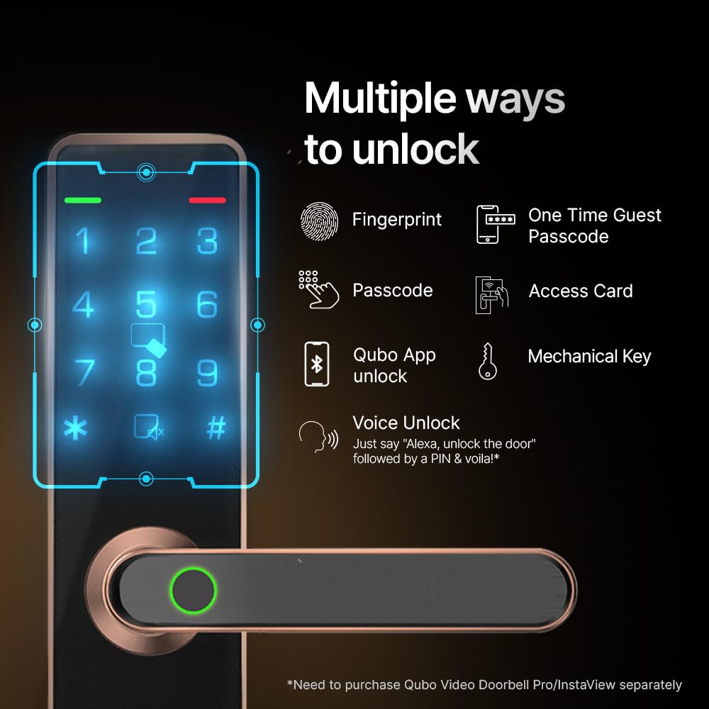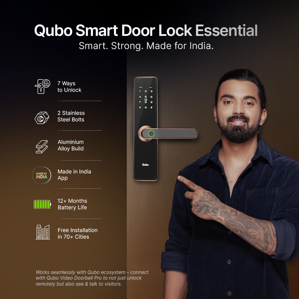 QUBO Smart Door Lock Essential (2025 Edition) from Hero Group | 7-Way Unlocking | Fingerprint | OTP Remote Unlocking | PIN | RFID Card | Mobile App | Mechanical Key | 2 Year Brand Warranty | (Copper)